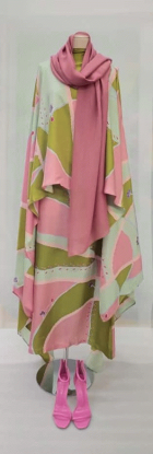 Pakaian kasual dengan gabungan top, skirt, selendang dan high heeled shoes.