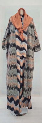 Pakaian kasual dengan gabungan long jacket, kemeja, pants dan tudung.