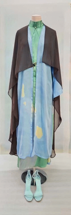 DRESS, LONG JACKET, SELENDANG DAN HIGH HEELED SHOES